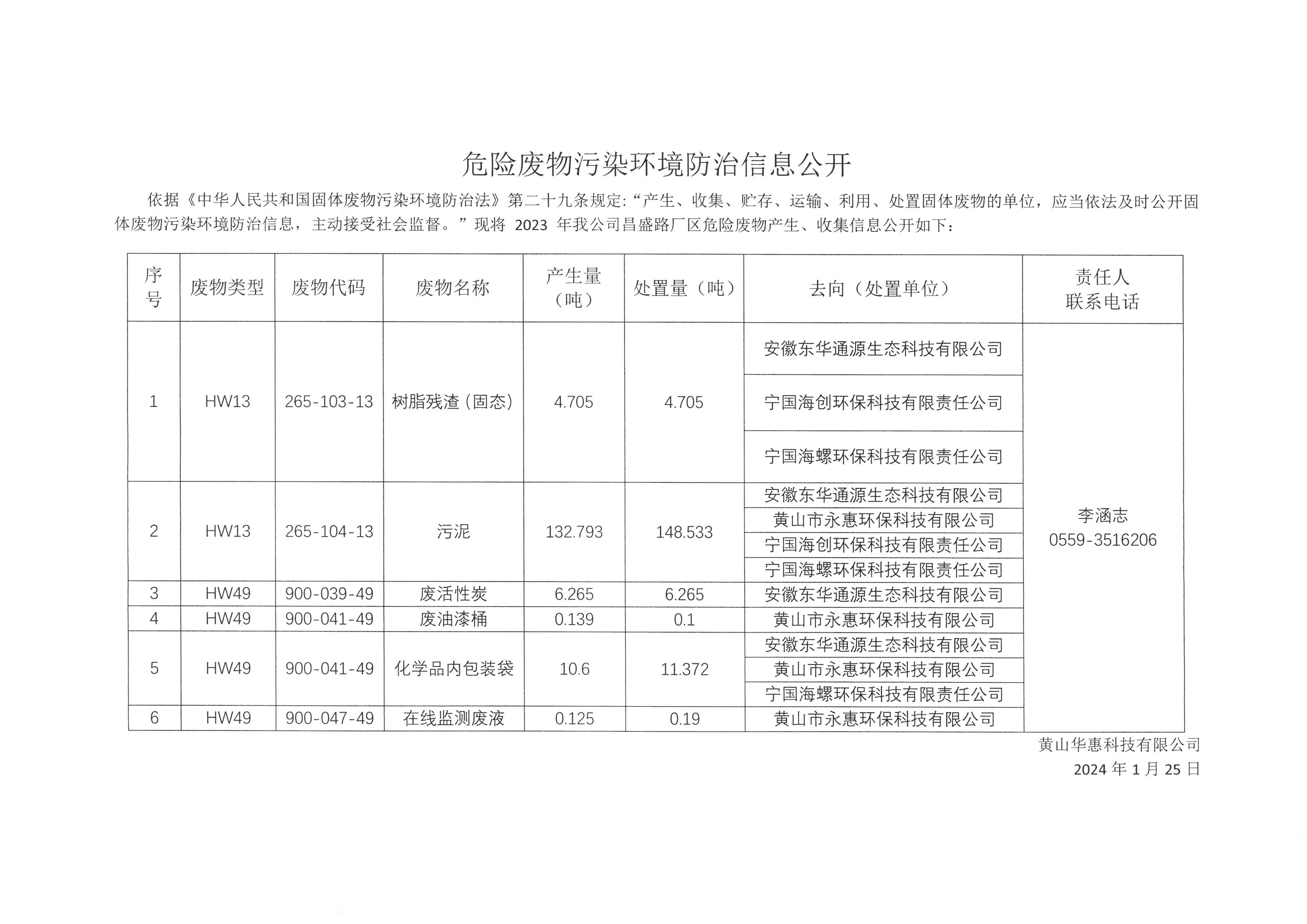 黃山華惠科技有限公司危險廢物污染防治信息公示