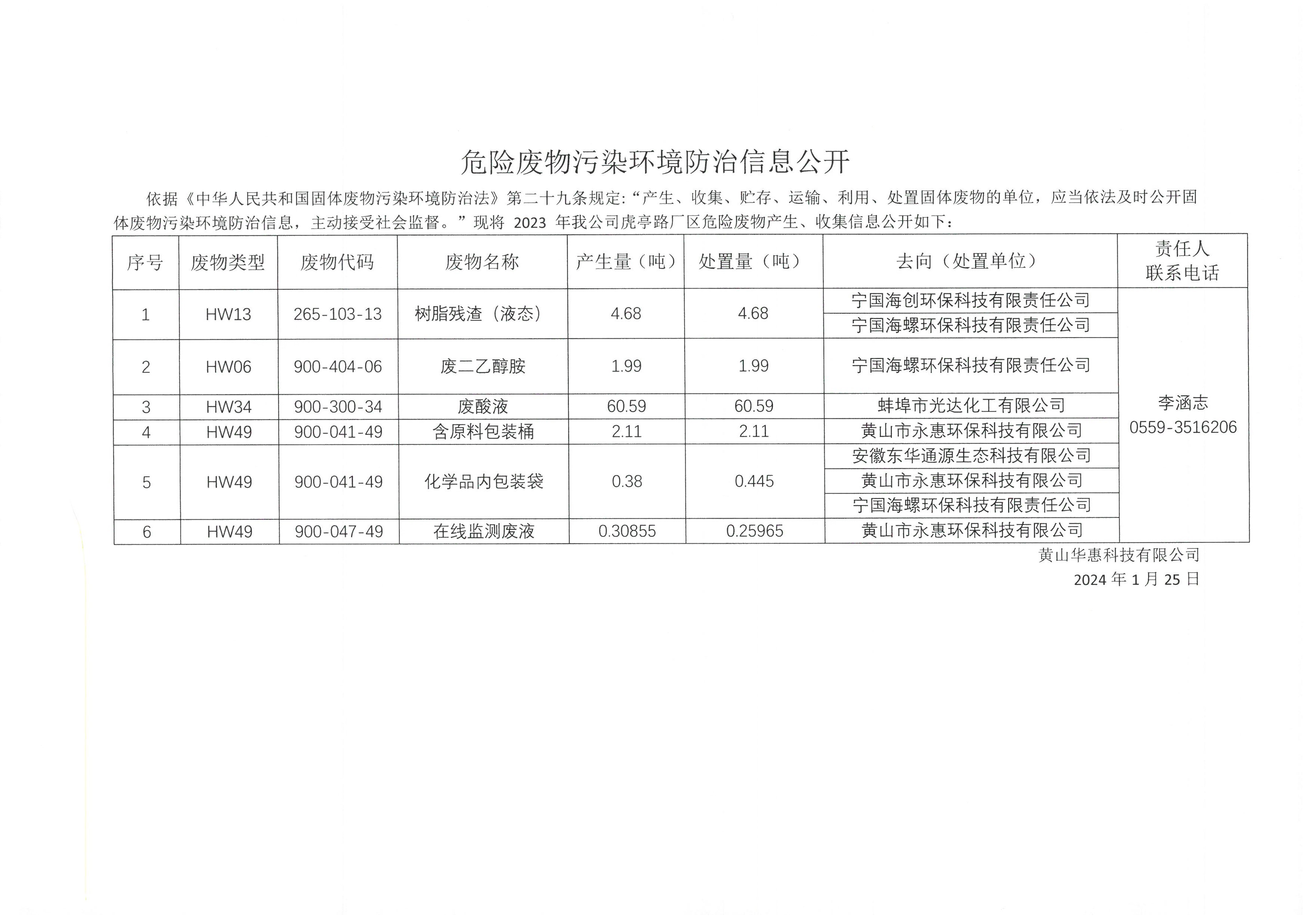 黃山華惠科技有限公司危險廢物污染防治信息公示
